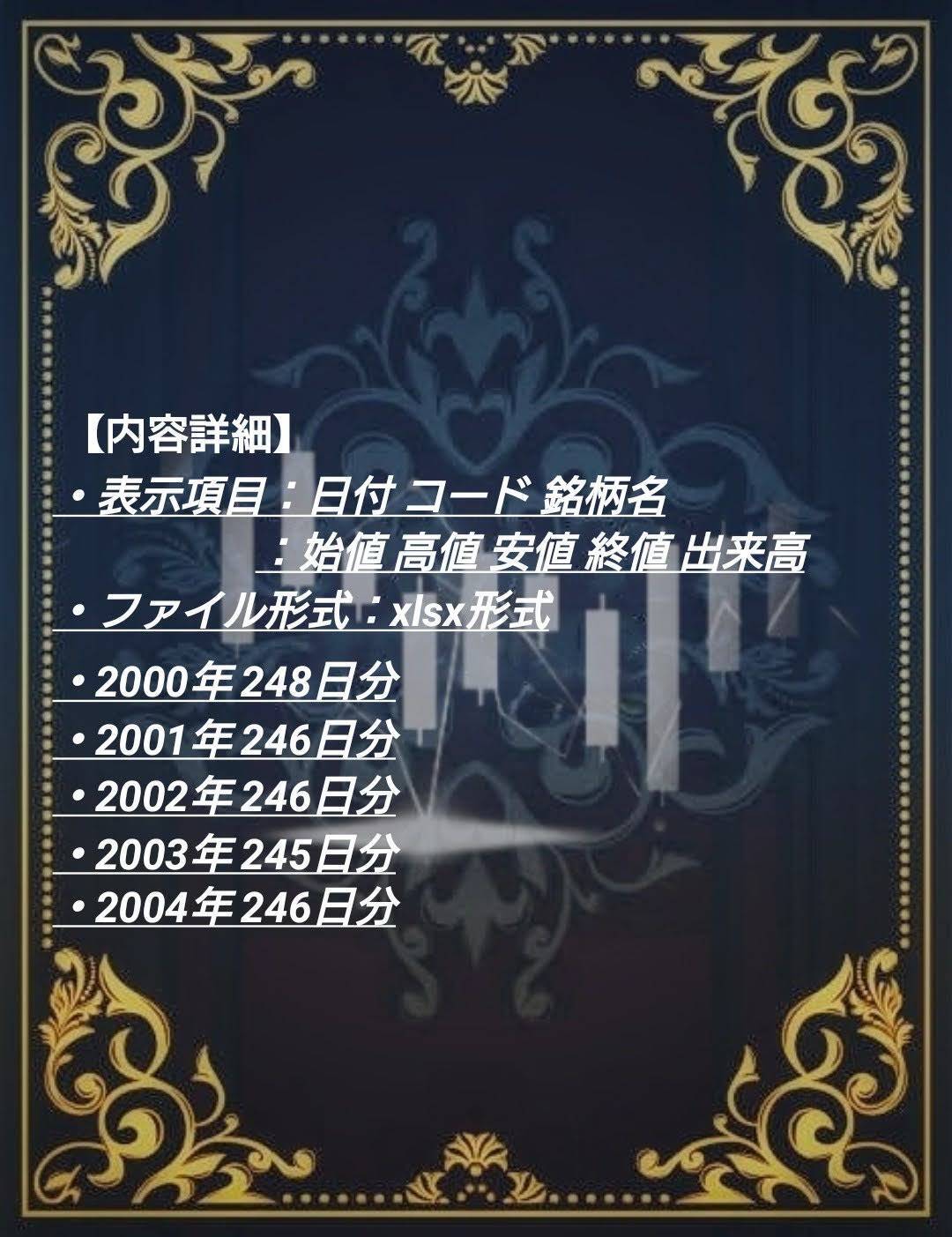 当サービスでは、2000年から2004年までの 市場全体の四本値(日足)データ を提供。